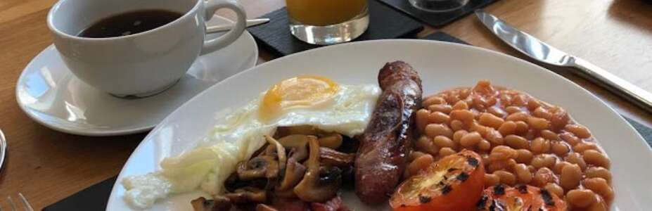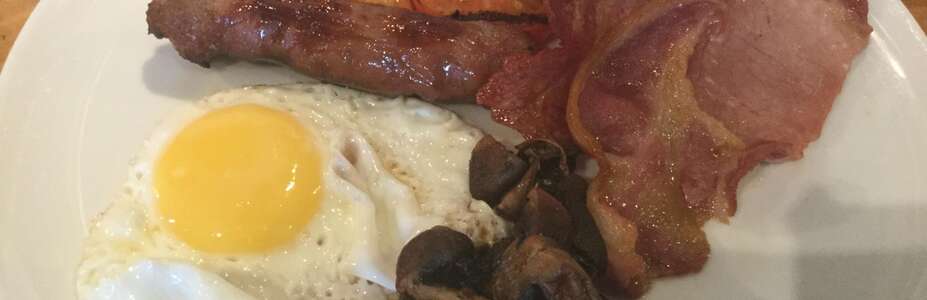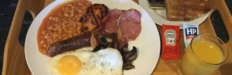 - Full English breakfast (bacon, sausage, baked beans, grilled tomato, mushrooms and a choice of egg (fried, scrambled or poached).