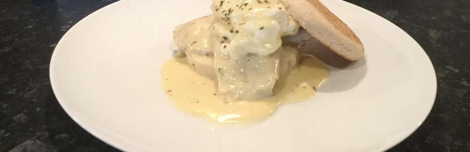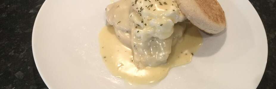 - Smoked haddock fillet with poached egg, on a breakfast muffin with a Mornay sauce